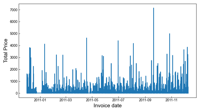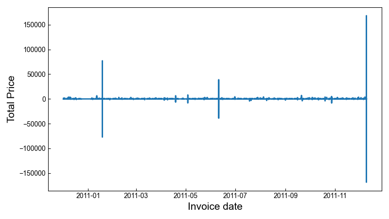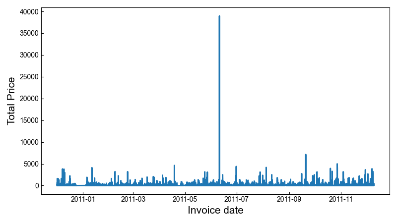 実際に購入された商品を対象に、InvoiceDate(決済日)を横軸に売上金額を描画してみます。2011年5月と2011年7月の間に1本突出した部分がありますが、Fig. 1のようにマイナスの部分やはなくなりました。一方で、突出した部分があるのが気になります。